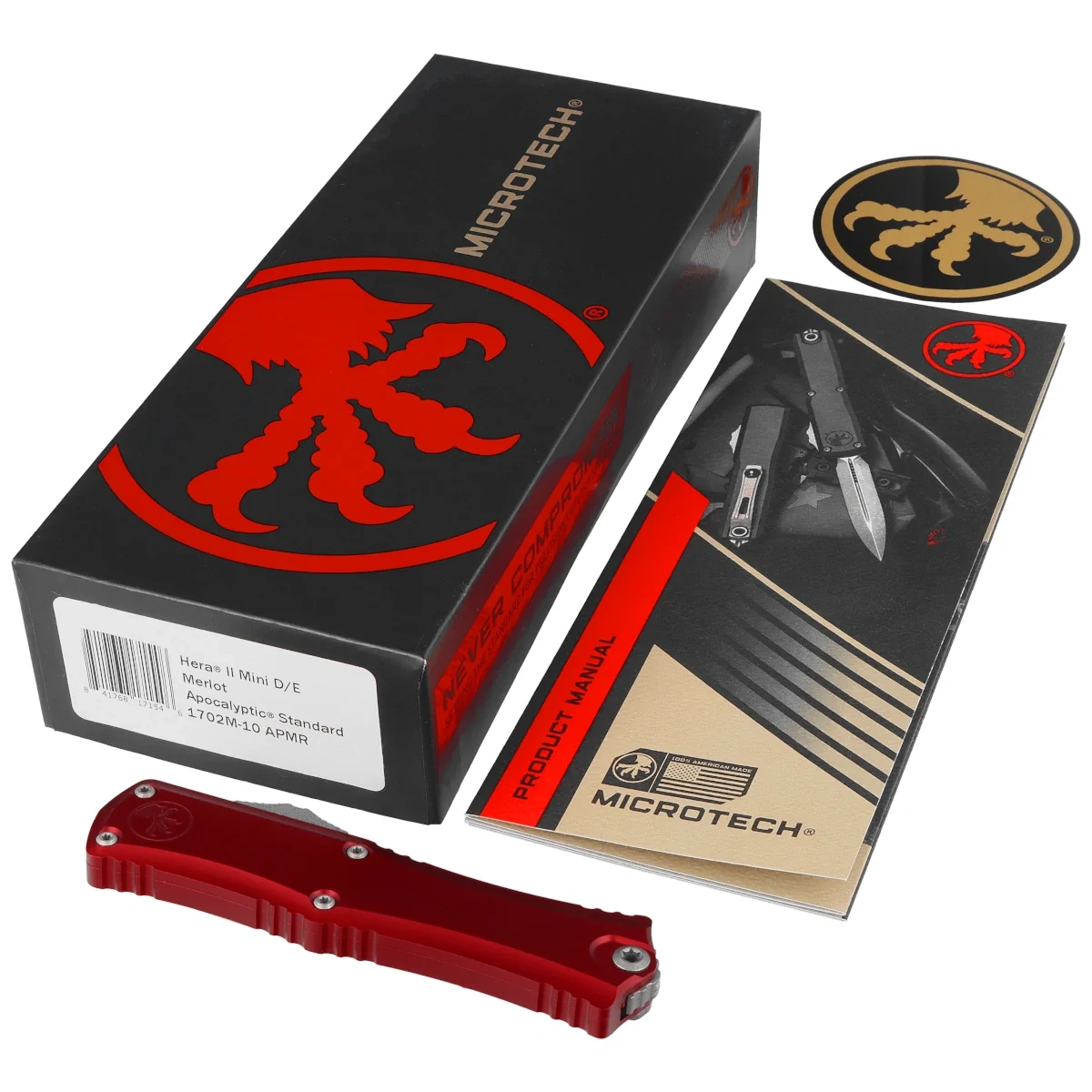 - Hera 2 Mini D/E Merlot Aluminium, Apocalyptic compact version of one of the best OTF knives, inspired by Troodon. Lightweight and easy to carry, while retaining the power and performance of larger designs. Project by A. Marfione owner of Microtech Knives.