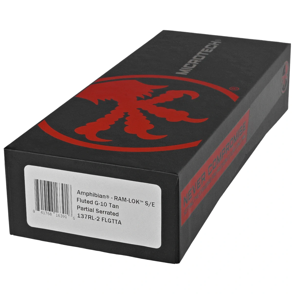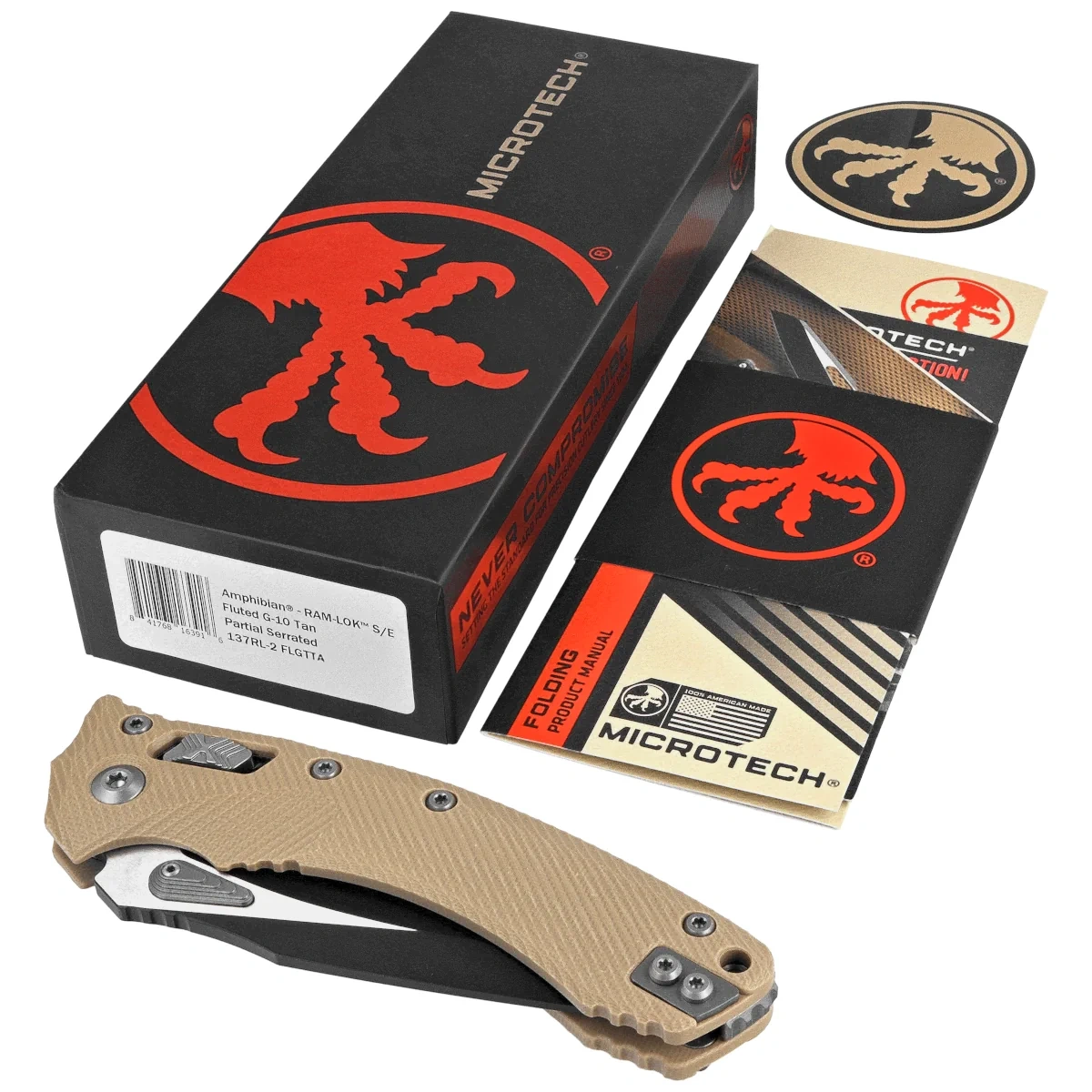 - Amphibian Ram-Lok S/E Fluted Tan G10, Black P/S reissue folding knife with intuitive RAM-Lock. Superior M390MK blade steel, the result of collaboration between Microtech and Bohler engineers. Ergonomic Handle. Design by Anthony Marfione