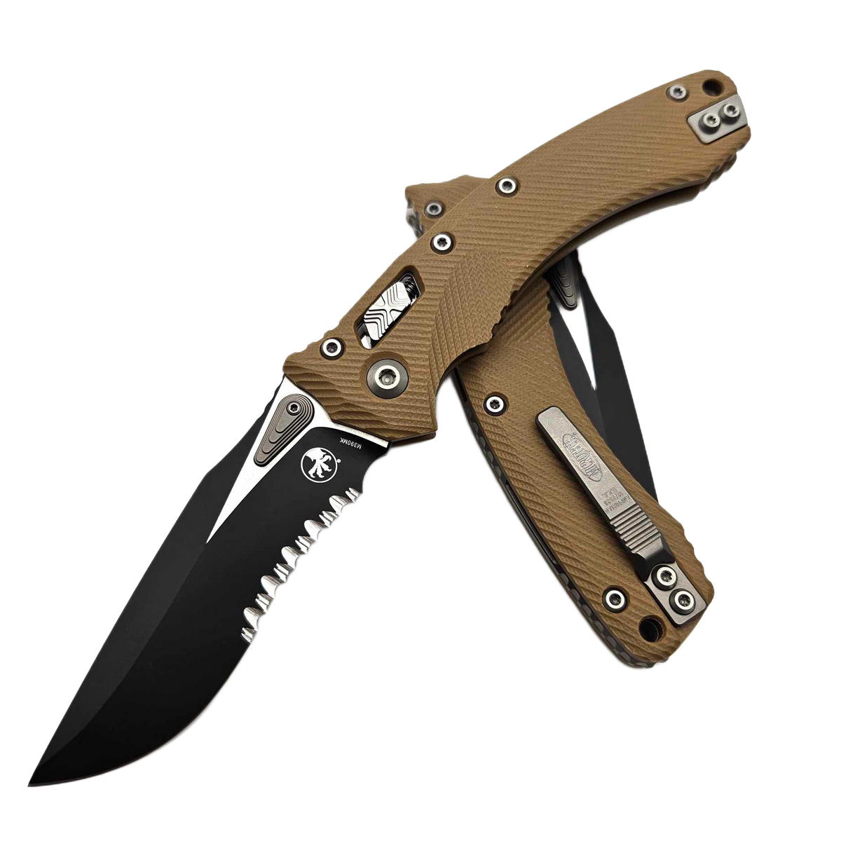 Handle - made of durable G10 composite, for better grip covered with milled lines(Fluted). Wide locking slide with Microtech's characteristic stepped X structure . Both grips have been screwed together with a solid backspacer. A double-sided (right / left) titanium clip allows you to discreetly carry the knife in tip-up position. Above the clip a lanyard hole, a place for a safety or decorative cord.