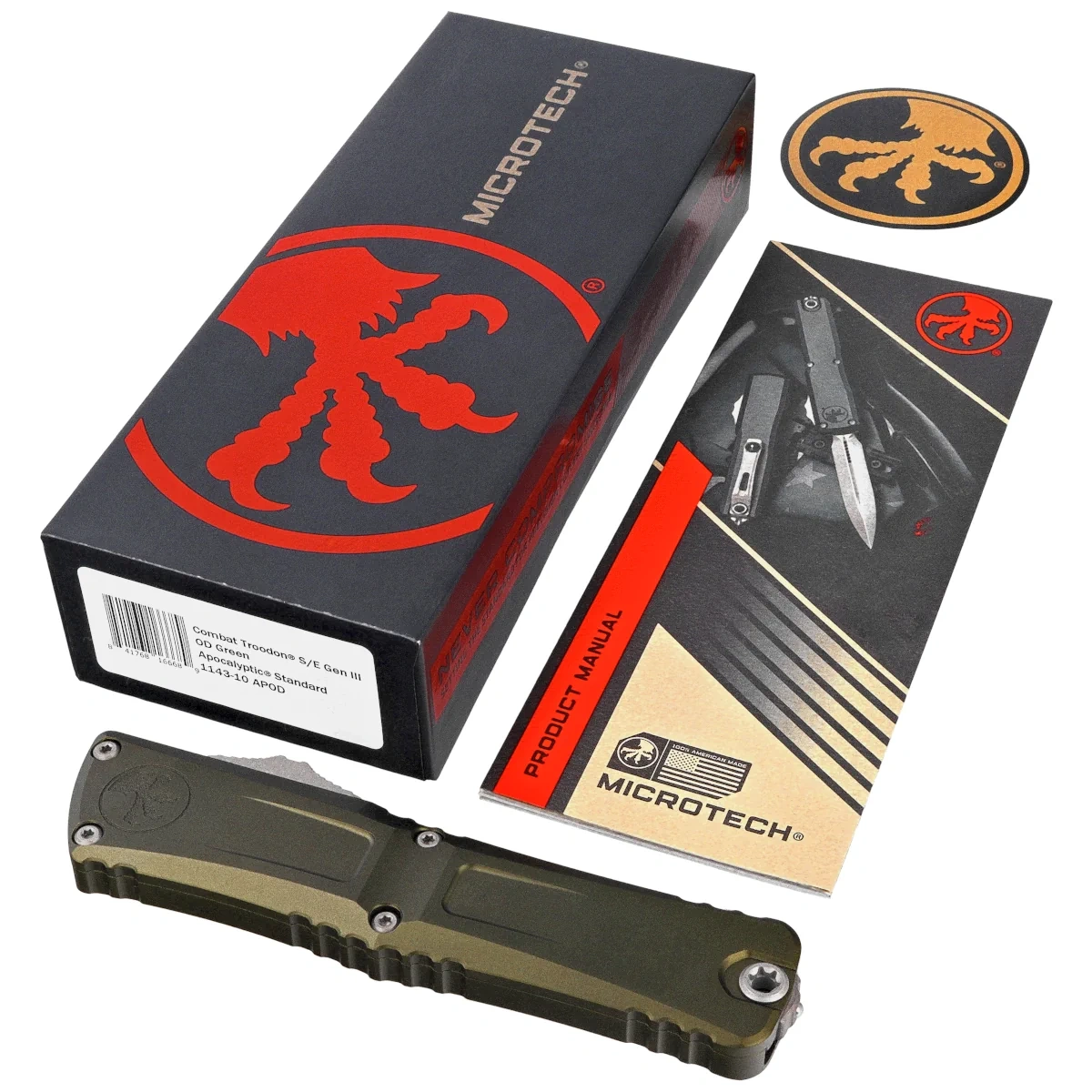 Combat Troodon Gen III S/E OD Green Aluminum, Apocalyptic this largest of the automatic knives is the pinnacle of precision engineering and tactical prowess in the field of OTF (Out The Front) knives. Built for a wide range of utility applications, it boasts a 25% larger size compared to the flagship Troodon. Precisely crafted, it features a sophisticated and hellishly fast mechanism that extends the razor-sharp blade. 100% made and assembled in the USA. Designed by Anthony Marfione, knifemaker and owner of Microtech Knives.