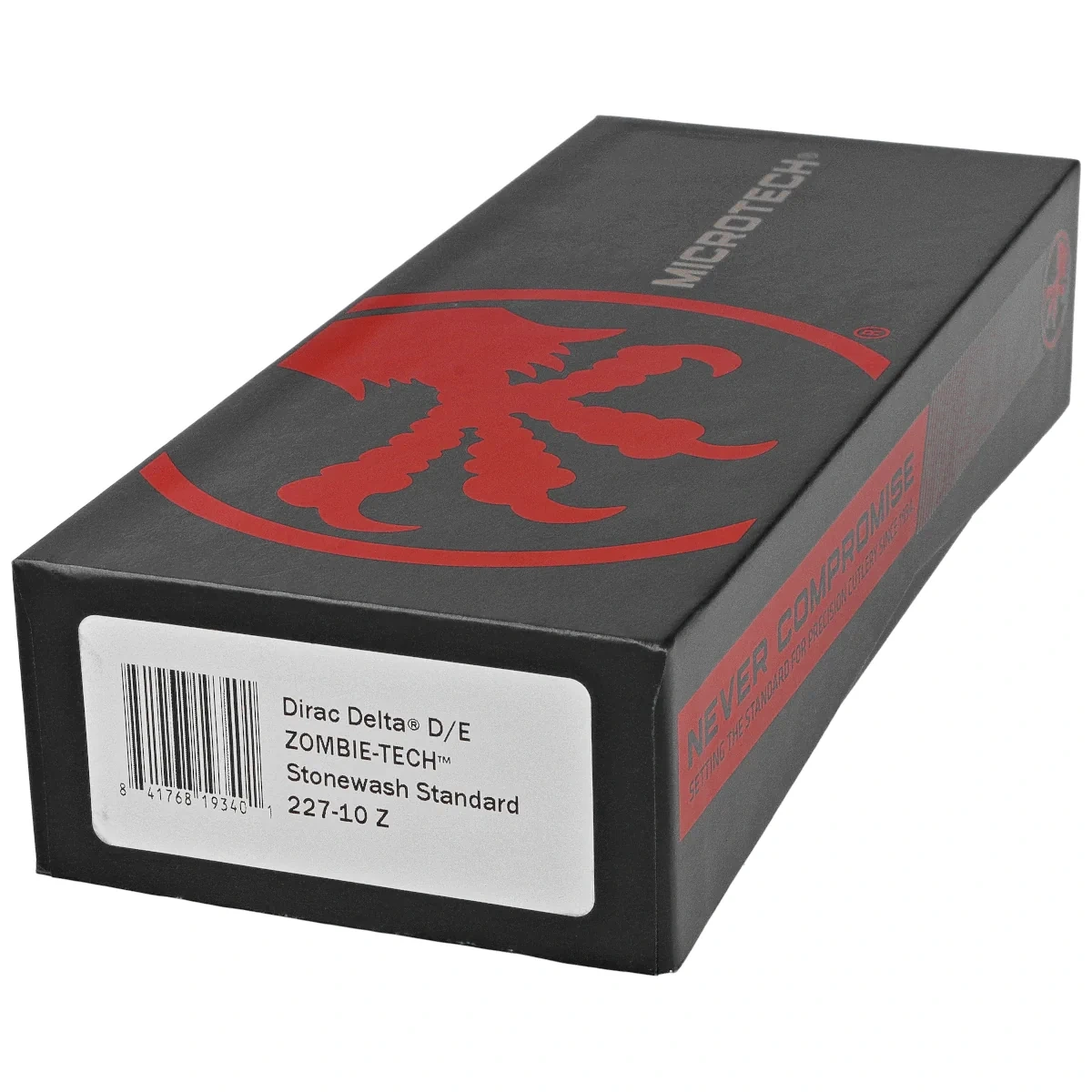 Dirac Delta D/E Zombie Tech Aluminum, Stonewashed is an enlarged OTF automatic knife from the Dirac series. Operating in D/A mode , it features a hellishly fast blade extension mechanism. Slider button on the side of the handle. 100% made and assembled in the USA. Designed by Anthony Marfione, knifemaker and owner of Microtech Knives.