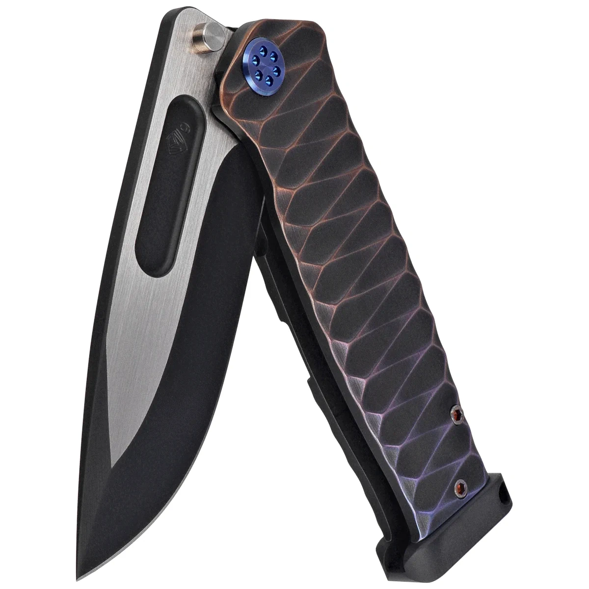 Handle - made of solid titanium was covered with carving ‘'Diamond Head’'. The massive head at the back of the Handle is responsible for balance and balance, and can also be used as an improvised hammer or glass breaker. The whole is complemented by a unique in form clip, also made of titanium, of course. The screws, like the clip, are dyed blue.