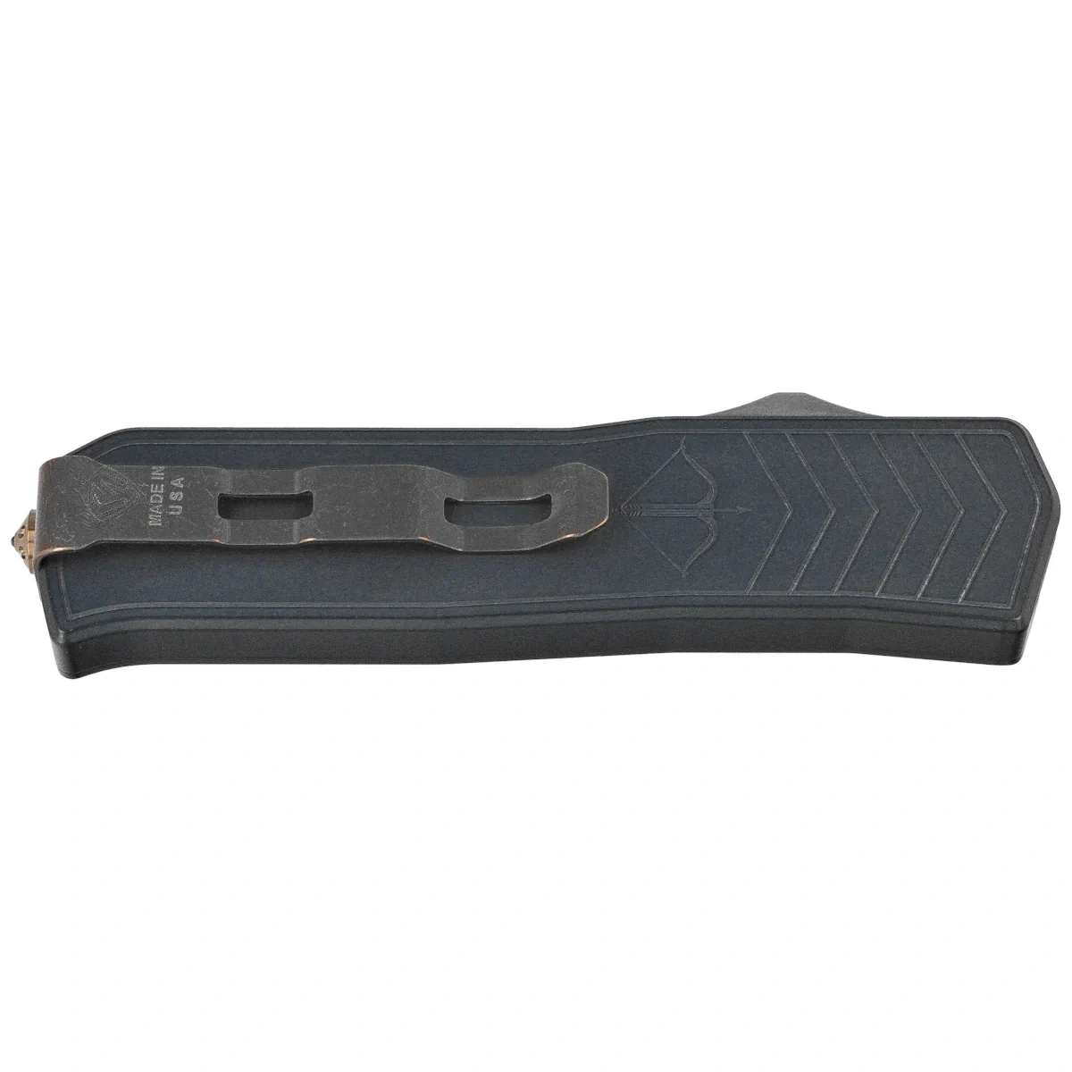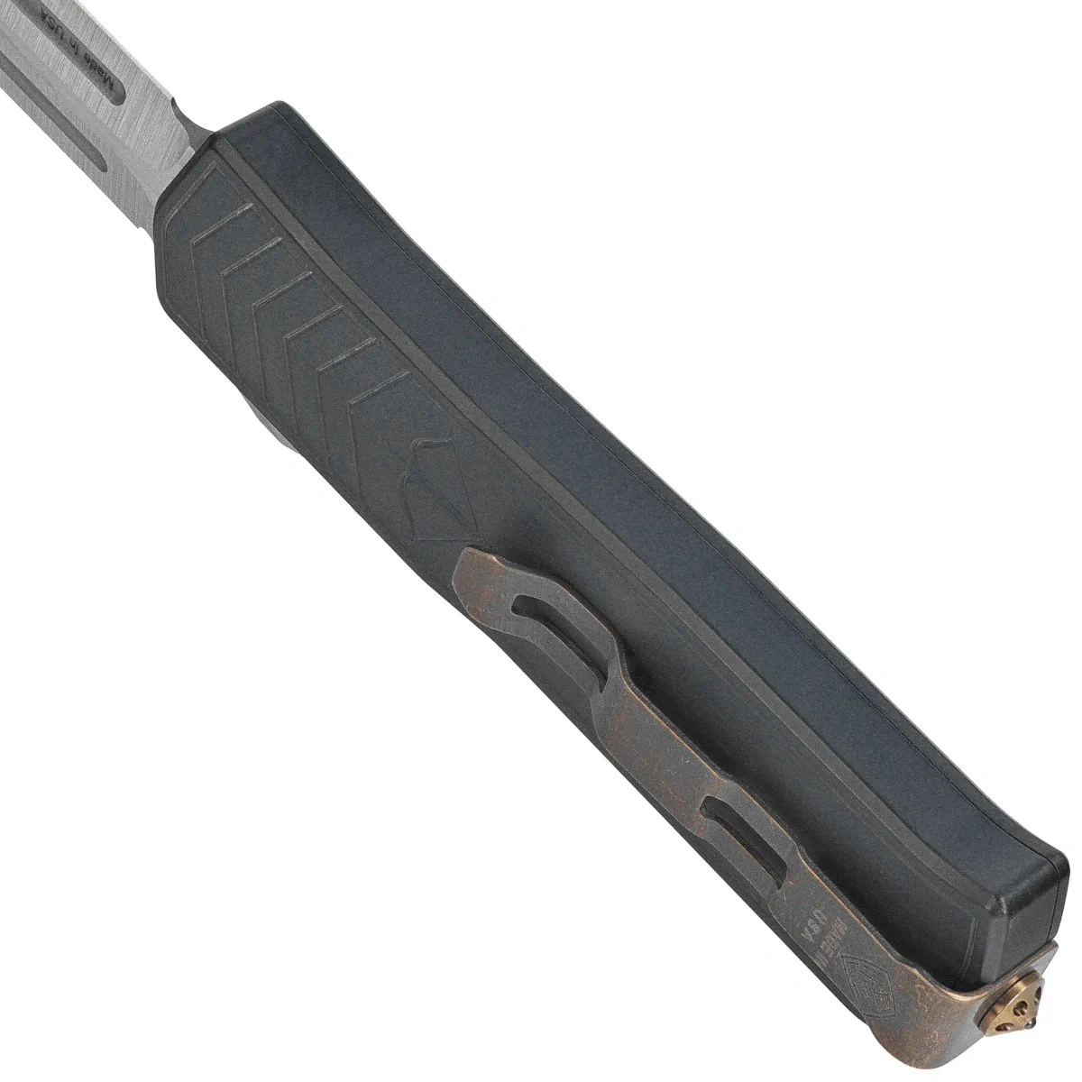 The MERC-1™ Blue Aluminum, Standard HW/Bronze Clip, Tumbled 100% made in the USA, with American materials, by a veteran-run company, a powerful OTF automatic knife built with Medford's trademark solidity.