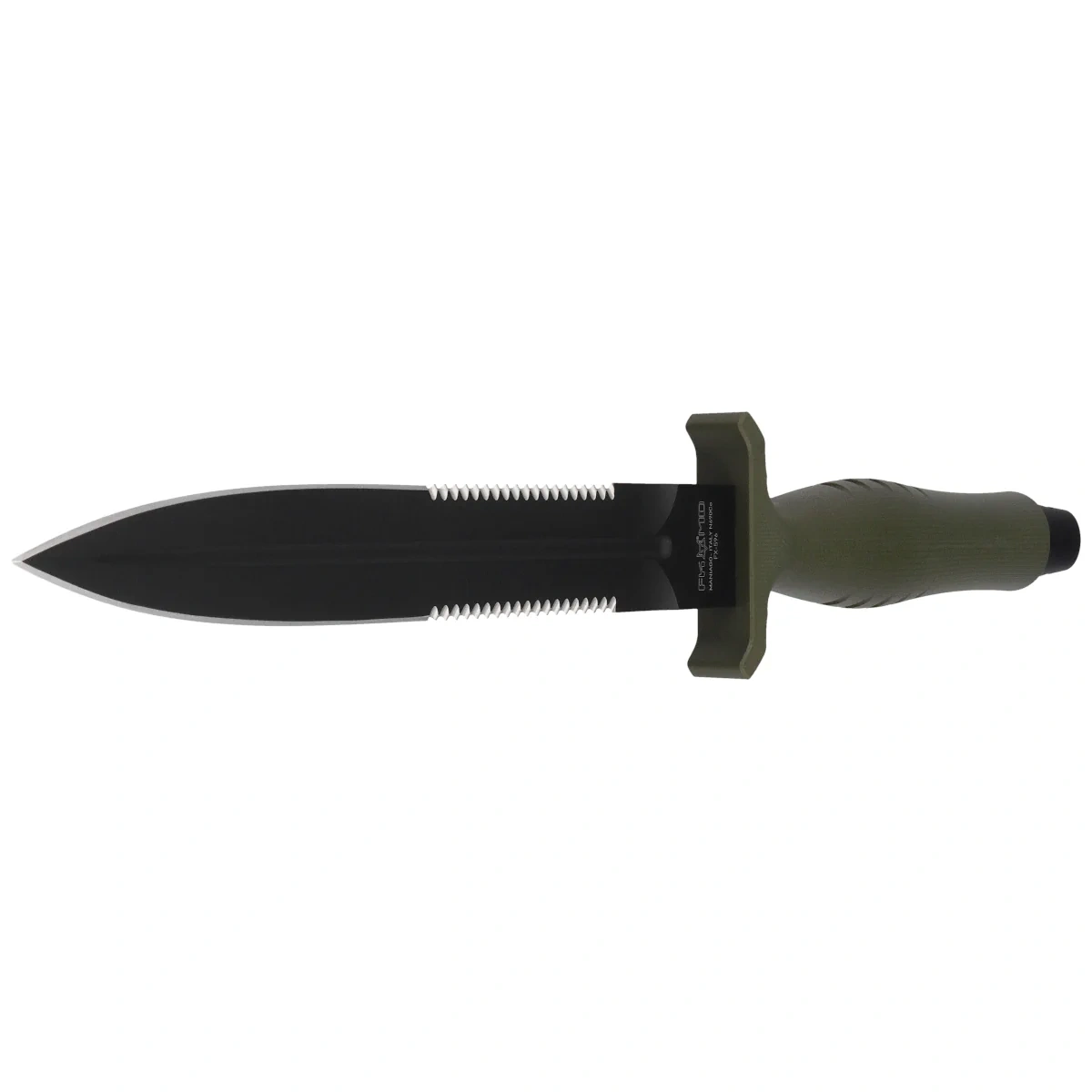 Blade - extremely slender with a Dagger shape with a double-edged symmetrical blade. The blade was coated with a black, non-reflective coating Top Shield®. The blade was derived with a Flat grind for excellent cutting and especially penetration properties. On both sides closer to the Handle a sawtooth blade with fine serrations. At the base of the blade double finger guard crossguard on both sides to protect the hand from slipping on the blade.