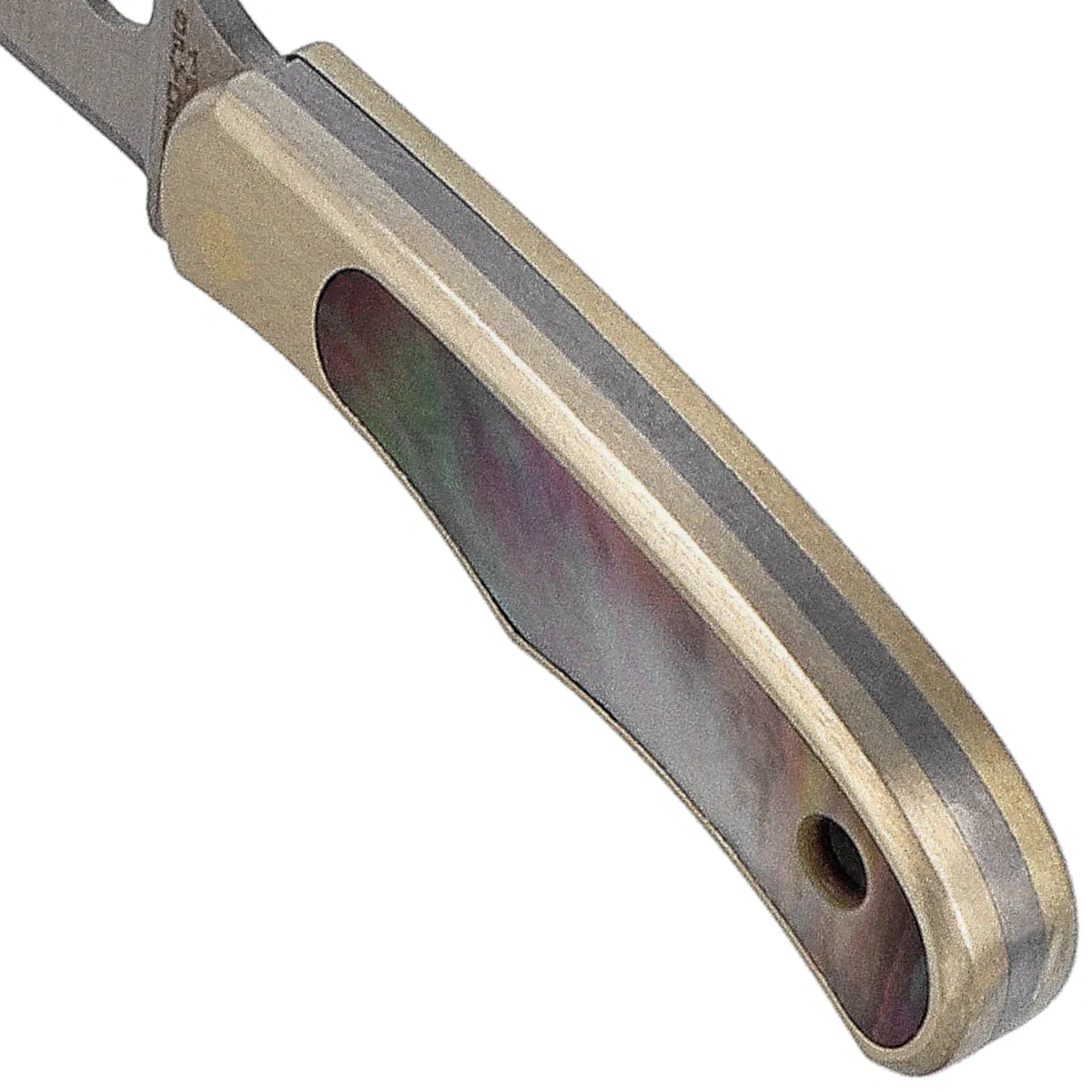 Handle - made of durable, heat- and cold-resistant, chemical-resistant brass, decorated with shell inlays. The grips are attached to a solid spacer (the so-called backspacer / handle grips linkage), which ensures the strength of the construction. In the back of the grip a hole(lanyard hole ) for attaching a safety cable or ball chain for hanging the knife around the neck or attaching to a key-ring / o-ring / key ring.