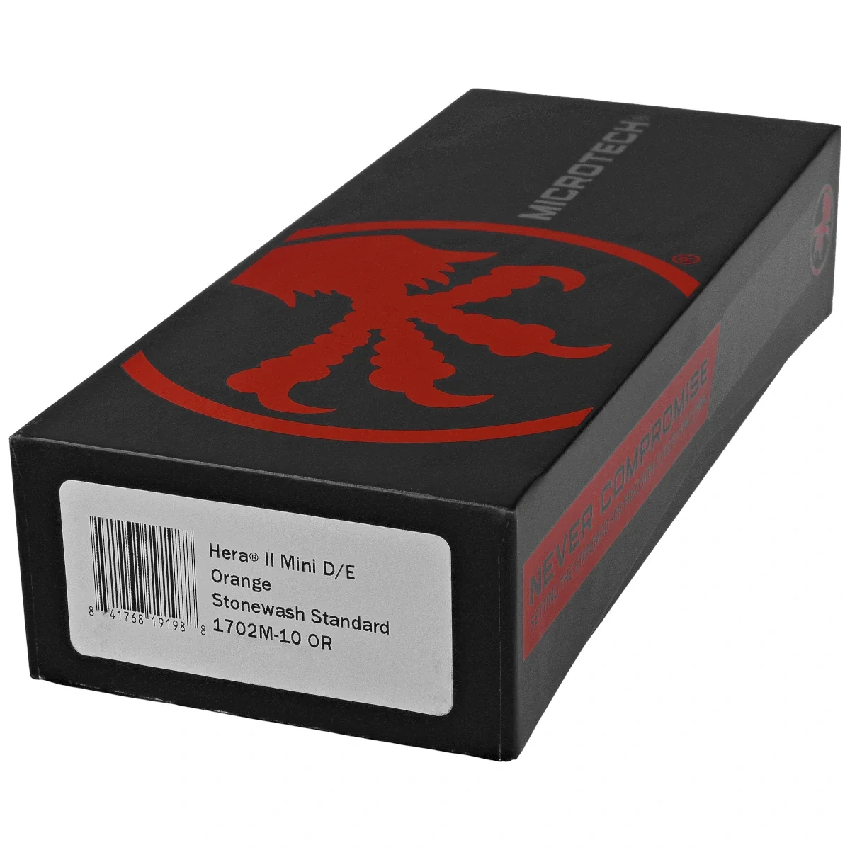 Hera II D/E Orange Aluminum, Stonewashed one of the most versatile OTF (Out The Front) automatic knives. Modeled on the iconic Troodon model , it is a link between EDC models and strictly tactical designs . An automatic of above-average strength with a mechanism operating in D/A (Double Action) mode, ensuring fast, strong and secure blade ejection and retraction. The model is distinguished by the excellent fit of the parts and the highest quality finish. The design is by Anthony Marfione, renowned knifemaker and owner of Microtech Knives.