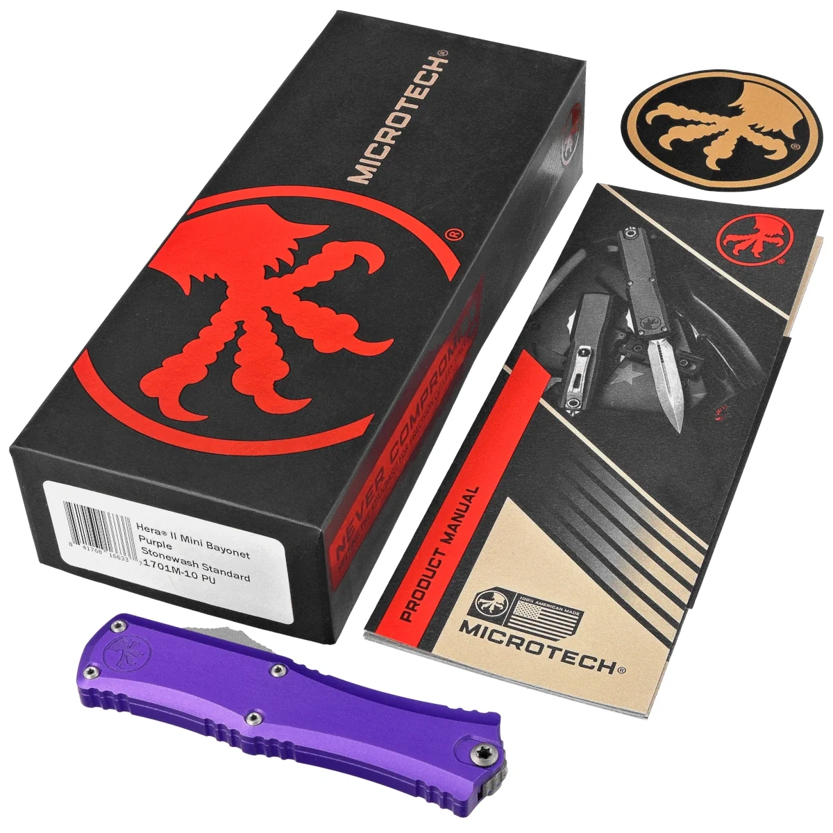 - Hera II Mini Bayonet Purple Aluminium, Stonewashed compact version of one of the best OTF knives, inspired by Troodon. Lightweight and easy to carry, while retaining the power and performance of larger designs. Project by Anthony Marfione.