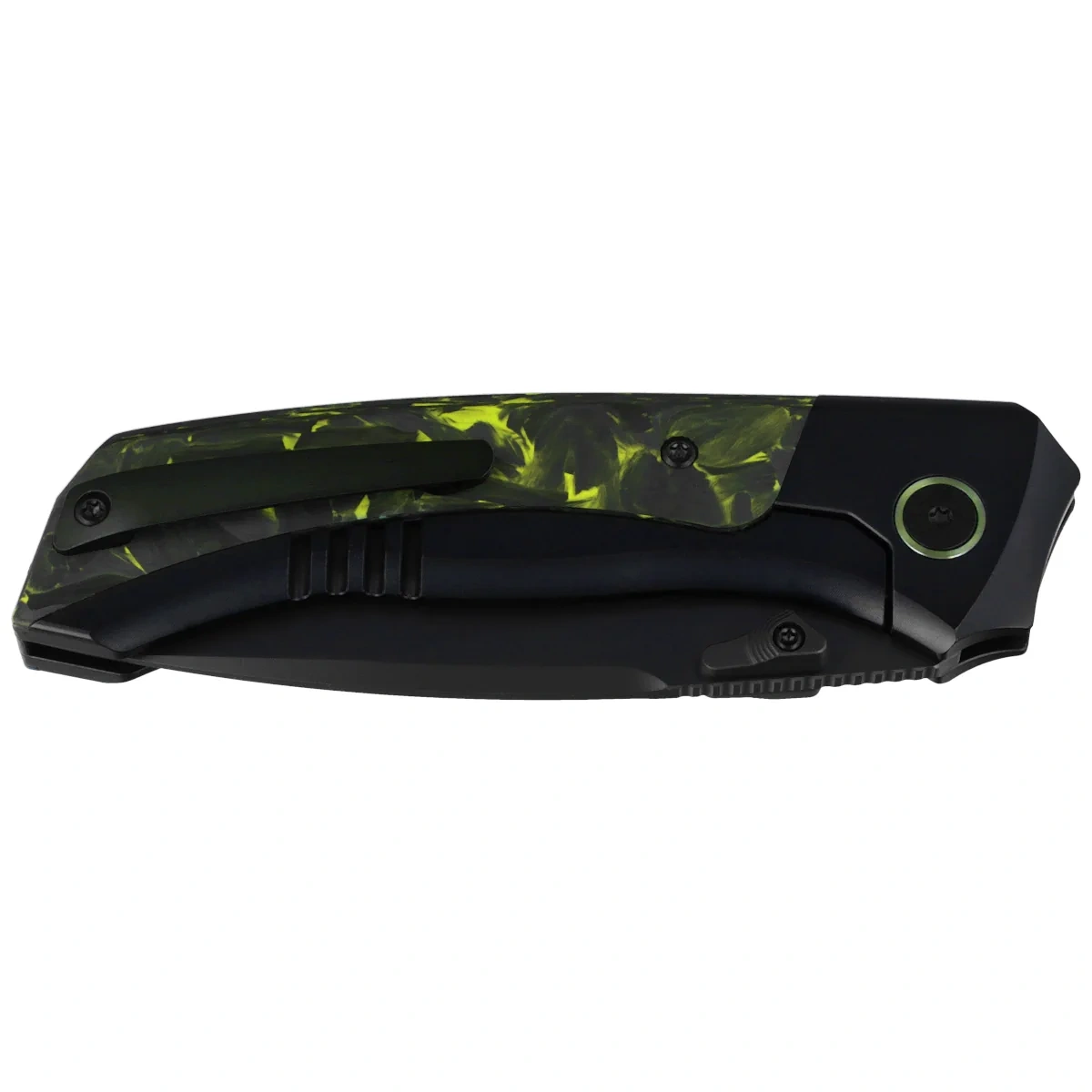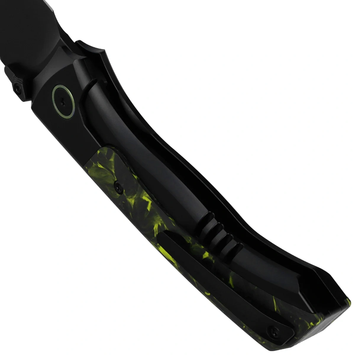 • RT-Steed Black Titanium/Black-Green Carbon Fiber, Black DLC is a modern premium EDC folding knife that combines refined mechanics, advanced materials and a sleek, technical form designed with conscious use in mind.