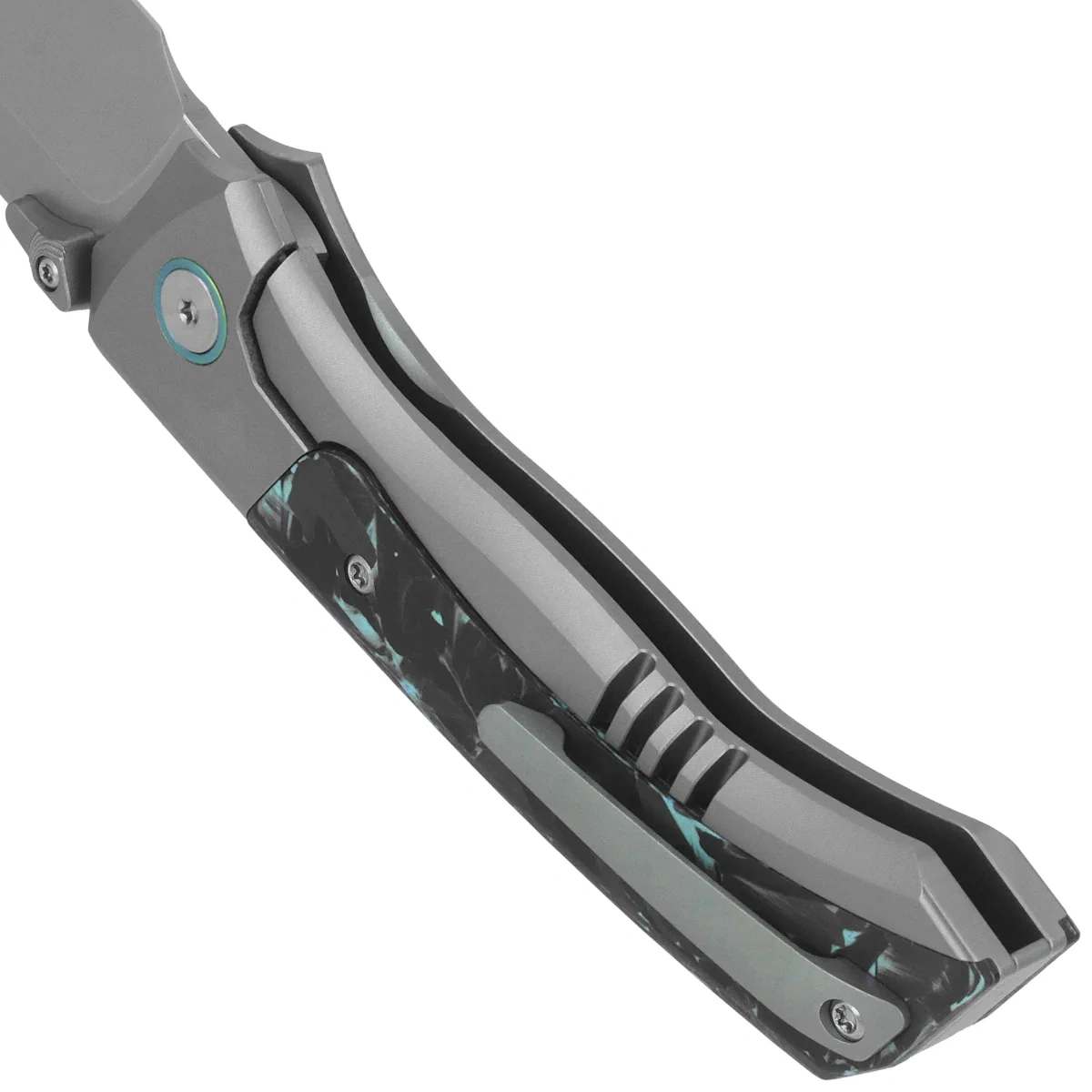Handle - based on titanium, complemented by carbon fiber composite inlays , which introduce material and visual contrast, while maintaining a favorable balance between weight and stiffness. The body has an ergonomic profile with a gentle curve, promoting natural hand placement and stable blade control during use. The ceramic sandblasted titanium finish increases surface friction, which translates into a secure grip even during prolonged use. The integrated titanium clip allows the knife to be carried conveniently and discreetly in tip-up configuration, without compromising grip ergonomics. Precision-matched hardware components underscore the high culture of the overall design. The RT-Steed Handle provides a stable, durable and aesthetically consistent platform for a modern premium EDC knife.