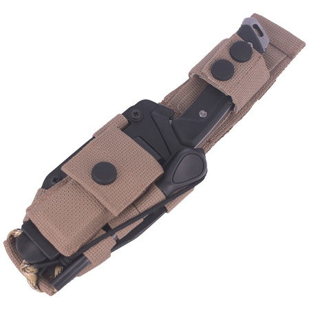 Pochwa - wykonana z kydexu i cordury posiada budowę modułową. W pełnej konfiguracji możemy powiesić kaburę na pasku, przymocować do oporządzenia wyposażonego w system M.O.L.L.E., w małej kieszonce schowany został dwustronny kamień do ostrzenia. Z boku kieszonki mamy miejsce na przenoszenie krzesiwa (w komplecie). Jeśli zaś wolimy minimalizm, możemy odczepić wszystkie te dodatki i zostawić tylko kydexową pochwę. Widać w tej konstrukcji lata doświadczeń projektanta znakomicie wykonane przez Extrema Ratio.